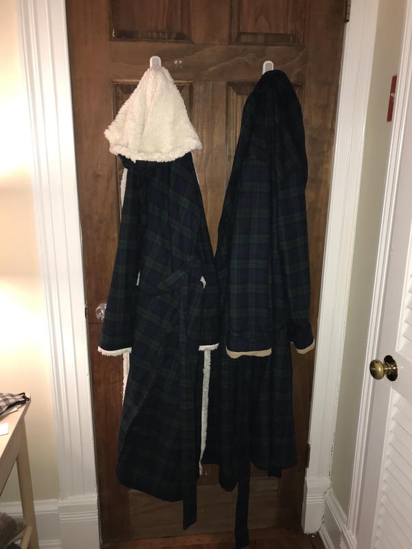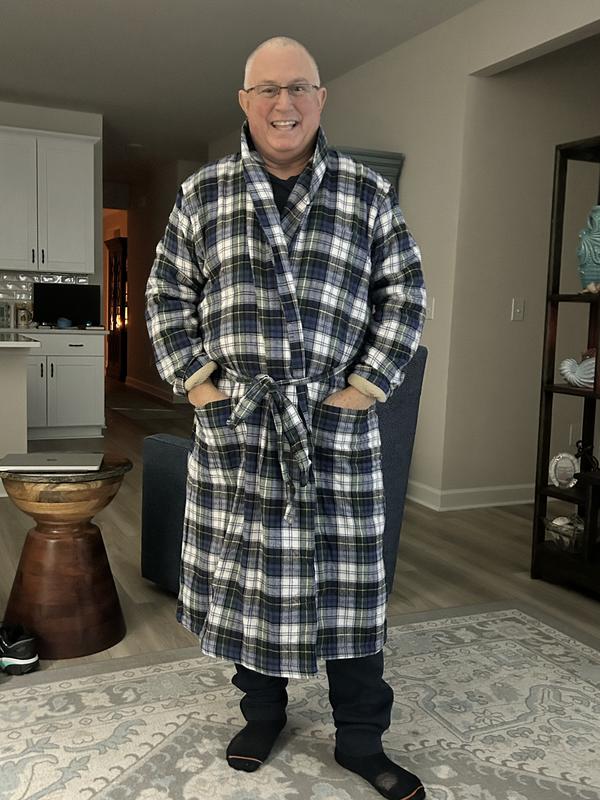 Inside, a plush sherpa lining adds another layer of warmth, making this robe a go-to for cold mornings and relaxing nights by the fire. Authentic yarn-dyed tartan patterns keep their vibrant colors wash after wash, and the thoughtful pocket placement ensures our phone, glasses, or reading material are always within reach.