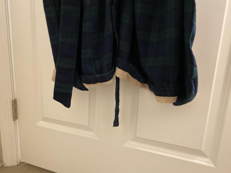 Great robe. Quality stitching and fit. Sherpa lining is perfect for colder moments. Belt could use some attention as it’s a bit flimsy compared to the rest of the garment.