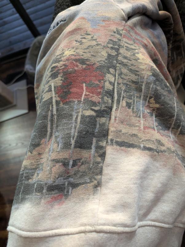 I saw this sweatshirt in the store and immediately loved it. The print on it has an almost watercolor effect to it. It's an LLBean Signature item, so I expected it would be good quality. I am glad I decided to try it on before buying it. I can wear a large in most item comfortably. I tried on the large size with a thin white tee shirt underneath and it was very tight. Not comfortable at all to wear. I purchased the XL size and should be able to wear a light weight shirt underneath. Considering people often like to wear shirts underneath a sweatshirt like this, I was surprised and disappointed in the sizing of this item. Still a very pretty sweatshirt.