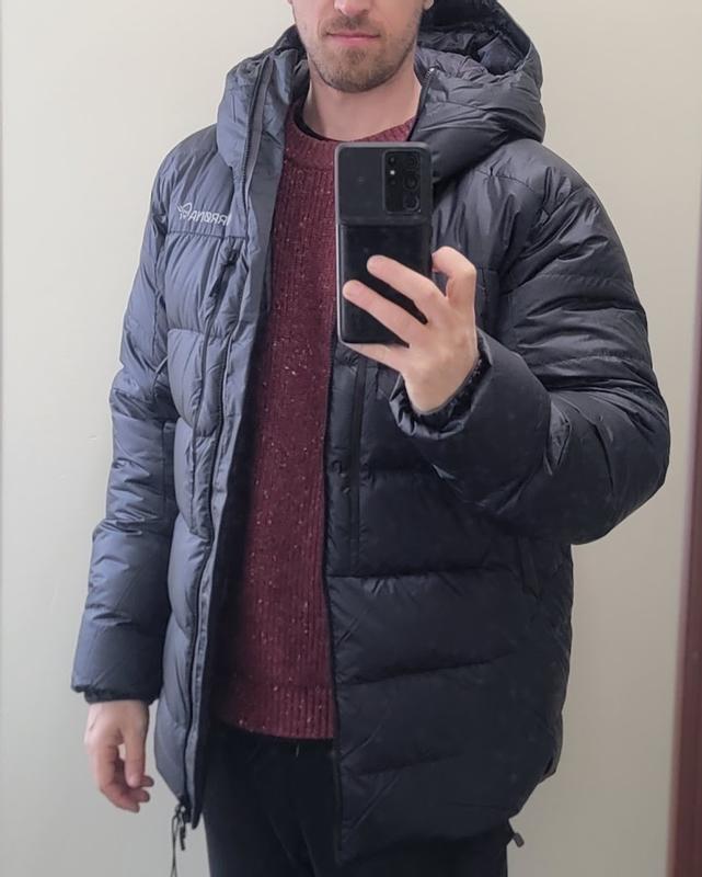 This is one of the warmest jackets short of only those with $1,000+ price tags made for Everest. I always run cold so hanging outside after a day in the snow, just was never quite enjoyable for me - until now. Post ski tour enjoying a beer at the trailhead? Throw it on. Strolling around Whistler after a day on the hill? Throw it on. Casually cruising groomers on a cold day? Throw it on. Need to walk the dog and it's -20? Throw it on. You'll instantly be the coziest you've ever been in your life. Don't forget, it's decked out with features like elastic cuffs, multiple external and internal pockets including a dump pocket, a draw string hoodie, felt chin/ beard guard and extremely durable face fabric. I'm 5' 11" 165 with slightly above average broadness. The medium felt a tad bit small in the back and shoulders, and I wanted unrestrictive range of motion, so I sized up. I do look a bit like a marshmallow, but who cares - I'm so warm and cozy when I have this thing on. If I didn't care about range of motion as much and wanted something that looked a bit more 'neat' a medium would have been perfect. I don't remember there being a noticeable difference in length between the two. If you needed something a bit more technical, like with a belay button or lighter/packable, there might be some better options from Rab, but if warmth, durability, features, and affordability (compared to Everest jackets) are your main priorities, this jacket is for you!