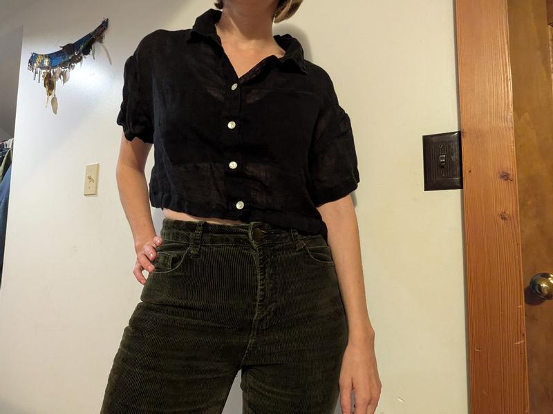 [This review was collected as part of a promotion.] Very cute crop top that layers nicely with high waisted pants. Could be an informal professional top or cover up on the beach, very versatile. However, it does require ironing